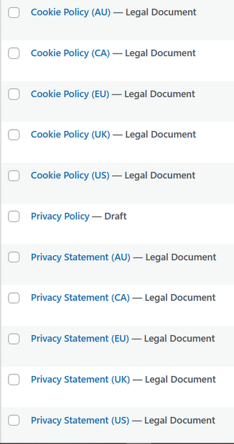 Dato che la suite Complianz provvede a tutto, ecco redatte TUTTE le Privacy e le Cookie, sotto forma di Pages relative alle normative dei diversi paesi. Dovrò sistemarle al di sotto di una Parent.